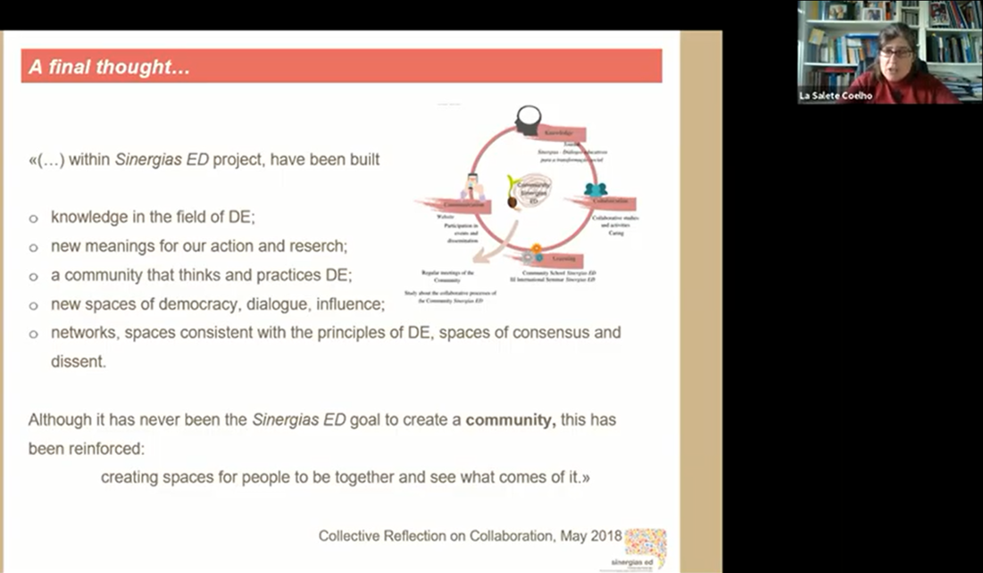 Deste modo, passámos do habitual Encontro Internacional em formato presencial, para um formato virtual, onde para o qual foi necessário explorar as potencialidades tecnológicas ao nosso alcance. Assim, ao longo do mês de maio de 2020, durante 5 sessões espalhadas por 3 semanas, realizou-se o Ciclo de Webinars Internacionais "Sinergias de Educação para a Transformação Social".